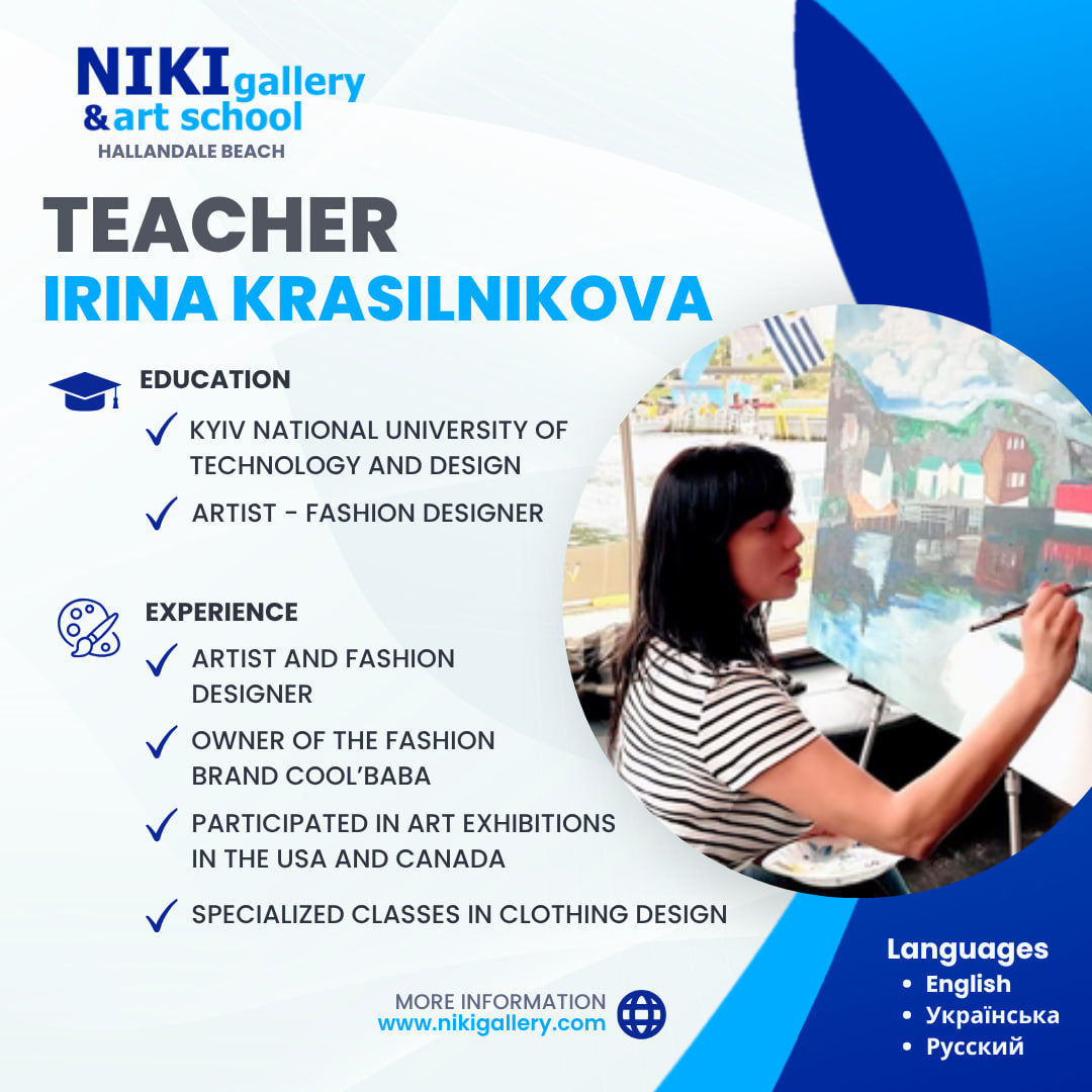 Creative people who are passionate about fashion. Students are accepted from ages 12 to 100 — a mixed-age group for everyone who shares the same passion. We will create a portfolio with costume designs, develop a collection, and study fashion.